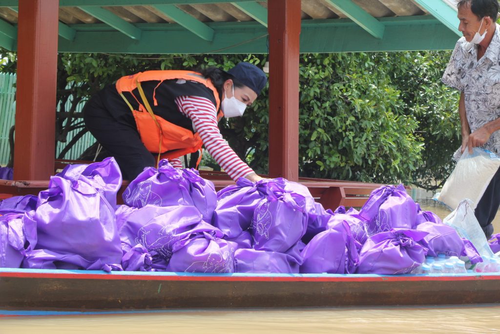 ซึ่งงานนี้ทั้งผู้จัดและเหล่านักแสดงก็ลงพื้นที่ลุยน้ำเอง ทั้งพายเรือ ลุยน้ำเข้าไปเคาะประตูพี่น้องชาวปทุมธานีเพื่อมอบของให้ถึงมือมากที่สุด บ้างก็ช่วยหิ้วของส่งถึงบ้านก็มี แม้ระหว่างทางฝนจะตกลงมาอย่างหนักจนต้องรีบขึ้นฝั่งแต่เมื่อฝนหยุดก็ลงเรือลุยน้ำแจกต่อจนเสร็จภารกิจ โดยงานนี้ต้องขอขอบคุณผู้ใหญ่บ้าน อนุวัตร ใจชอบ ต.เชียงรากน้อย อ.สามโคก จ.ปทุมธานี ที่มาลงพื้นที่ช่วยประสาน ช่วยลากเรือ ร่วมตากฝนแบบเต็มที่ไม่ถอยเหมือนกัน ทั้งนี้ผู้จัด กบ ปภัสรา ได้เผยความรู้สึกหลังเสร็จดังตั้งใจในครั้งนี้ว่า